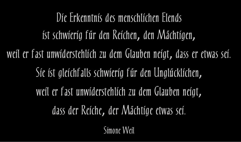 textarbeit erwünscht KameleElmar kommentierte Létranger's Thema in der Kategorie Mythenreich & Fantasie Hallo L'étranger, vielen Dank für deine Gedanken zur Entstehung deines Gedichtes. Ich empfinde deine Herangehensweise sehr undogmatisch und kreativ. Zu deinen Gedanken über die Reichen und Mächtigen fiel mir spontan der folgende Text der jüdischen Philosophin und Mystikerin Simone Weil ein, die ich, neben Meister Eckhart, sehr verehre. Herzlichst Elmar