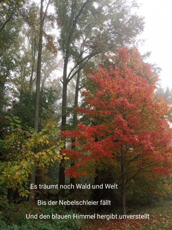 Der letztmalige Farbenrausch des Herbstes. Blätter tuscheln im pfeifenden Wind bevor sie losreißen. Tanzen übermütig wirbeln wollen daß wir den Abschied gutheißen. Einmal noch auf Wiedersehen winken. Eh sie verblassen und sich abschminken. Komm gehen wir eingehakt. Auf Fotojagd. Lassen die Umgebung uns prägen. Unsere Lebensfreude auslegen. Durch Blättermeere ausgelassen hasten. Entlang den Naturkulissen uns dankbar herantasten. ©Donna H. 12. November 2022 (Bilder/Text)